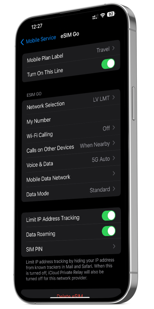 iPhone lietotājiem un jaunākajiem Android tālruņiem ir iespējams vienlaikus izmantot gan savu faktisko SIM karti, gan SimAbove eSIM. Izvēlies savu esošo SIM karti zvaniem un SMS, bet SimAbove eSIM- mobilo datu savienojumam. Ņem vērā, ka atstājot Data Roaming (viesabonēšanu) ieslēgtu esošajā SIM kartē, Tavs mobilā telefona operators var iekasēt maksu par datu viesabonēšanu līdztekus ienākošajiem/izejošajiem zvaniem un SMS. Lai izvairītos no šādas situācijas, pārliecinies, ka mobilie dati ir pārslēgti uz SimAbove eSIM.
