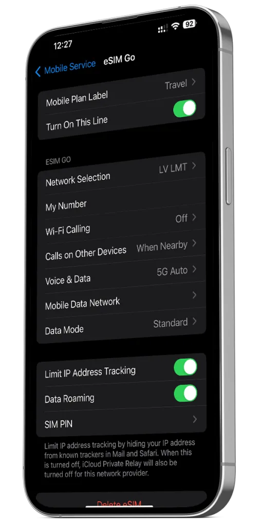 Помните, что тарифный план SimAbove eSIM активируется только после того, как Вы прибудете в пункт назначения. После прибытия зайдите в настройки телефона и включите роуминг данных для Вашей eSIM, а затем активируйте тарифный план SimAbove в настройках телефона.